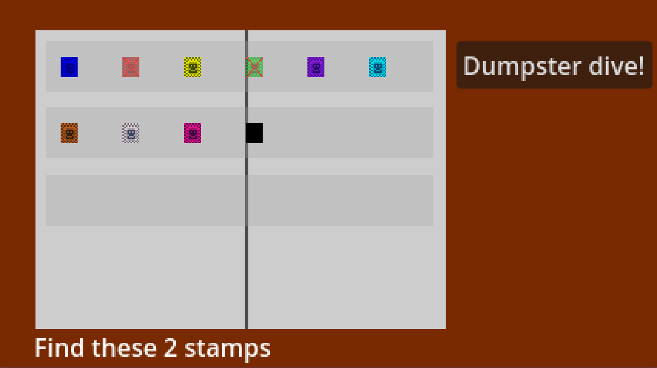 Gameplay: Your mission is to fetch a set of stamps from a dumpster. Pay attention to visual and audio cues while shuffling through a cardboard mess. Get the stamps before guards come! Six levels of diving envelopes from a cardboard pile.